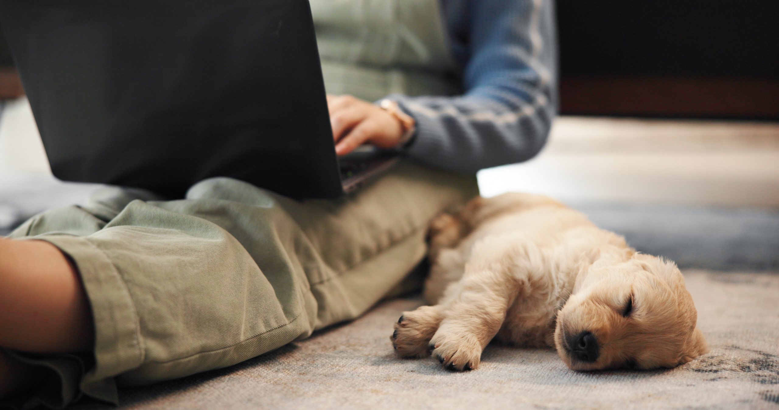 Laptop, person and puppy on floor in home for domestic companion, insurance and remote work. Freelancer, dog owner and online research with sleeping pet for security, loyalty and furry best friend Kelly Merry October 27, 2025 Read more